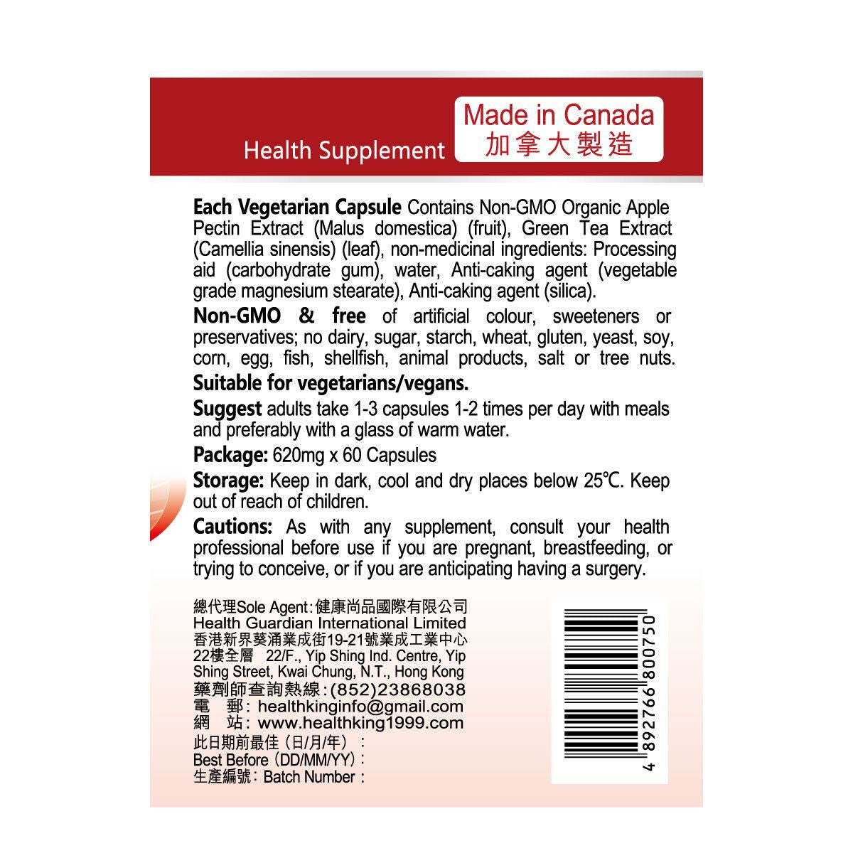 本品為非基因改造及不含人造色素、甜味劑或防腐劑;不含乳製品、糖、澱粉、小麥、麩質、酵母、大豆、玉米、蛋、魚、貝類、動物產品、鹽或堅果。適合素食者/純素食者服用。