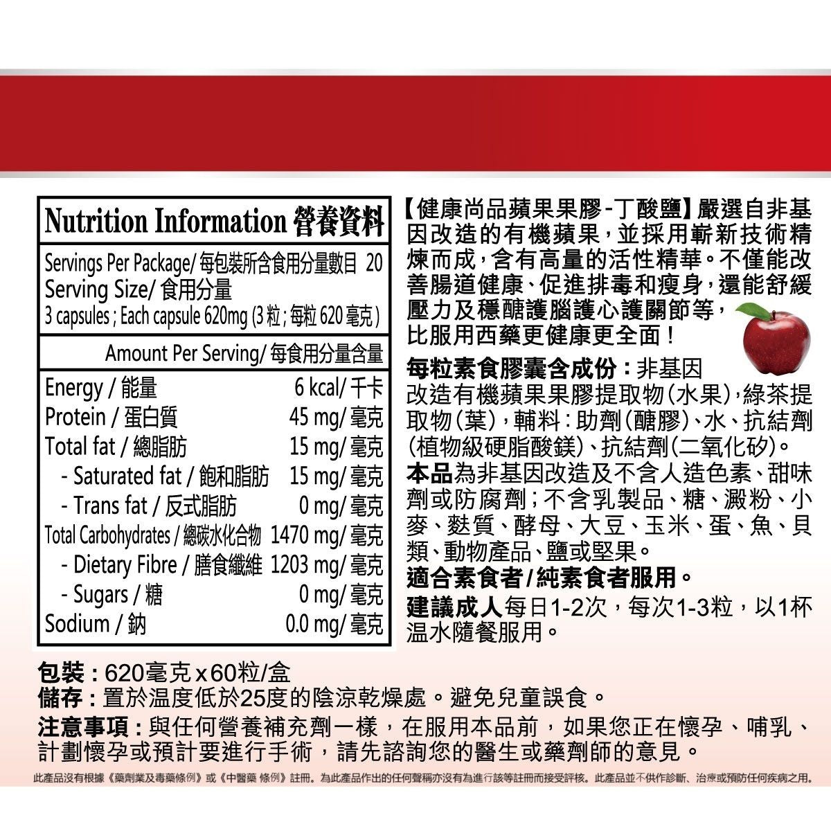 【健康尚品蘋果果膠- 丁酸鹽】嚴選自非基因改造的有機蘋果,並採用嶄新技術精煉而成,含有高量的活性精華。不僅能改善腸道健康、促進排毒和瘦身,還能舒緩壓力及穩醣護腦護心護關節等,比服用西藥更健康更全面!